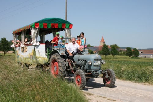 Wir fahren mit unserem Eicher Königstiger und einem umgebauten Anhänger durch die herrliche fränkische Landschaft und durchfahren Feld, Wald und Flur an den Hängen der Frankenhöhe.